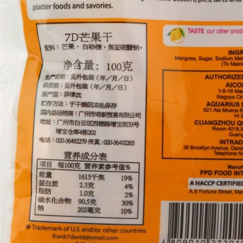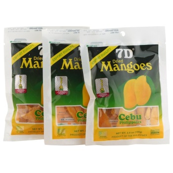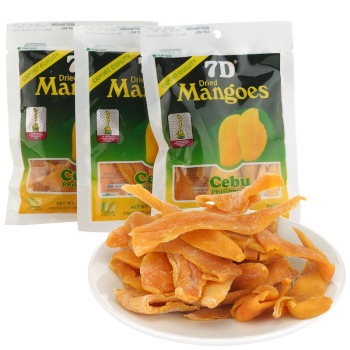 产品描述: 7D芒果干【配料】芒果、白砂糖、焦亚硫酸钠【净含量】100克【原产国】菲律宾【生产日期】见外包装(年/月/日)【贮存条件】于干燥阴凉处保存 7D芒果干生产商早期从事水果收购和销售,于1978年起开始加工芒果干,主要产品有芒果干,芒果汁和芒果蜜饯等。