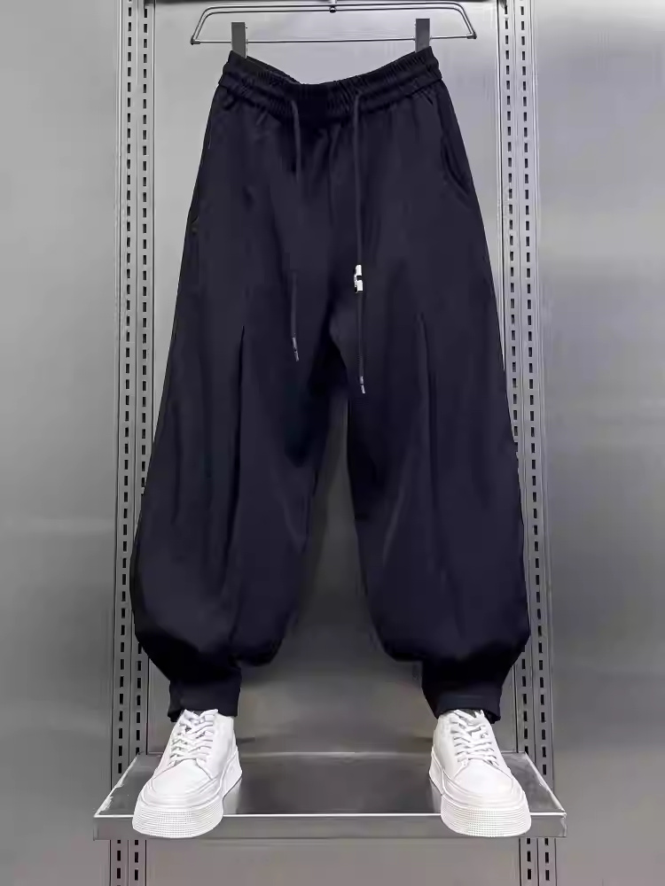 夏季薄款男士简约休闲裤垂感束脚阔腿裤纯色青年冰丝凉感弯刀裤子