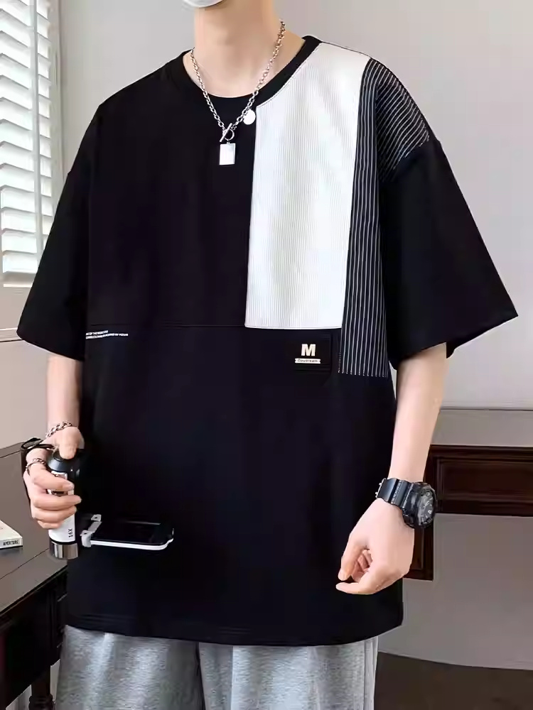 • 商品名称:重磅短袖T恤男夏季潮牌圆领阔版拼接半袖青少年宽松休闲五分体恤t