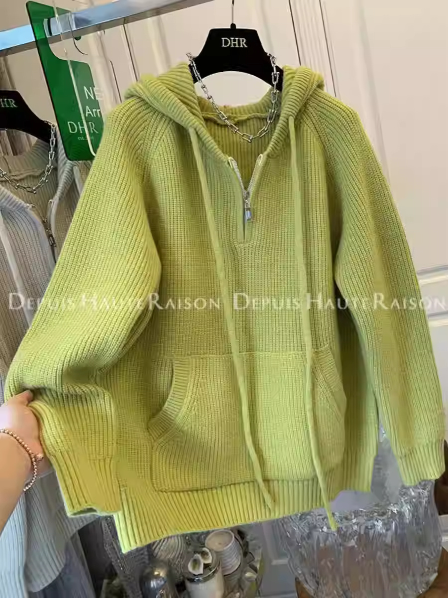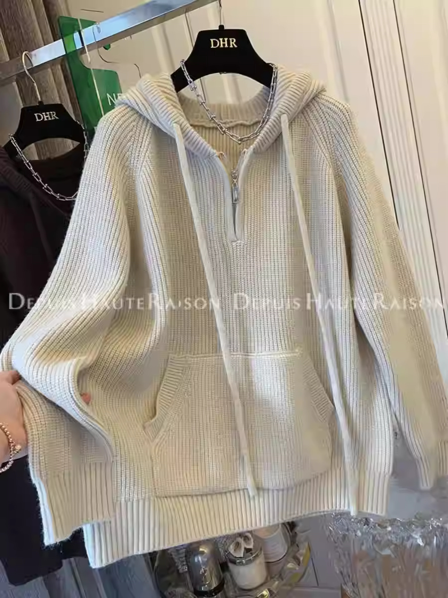 • 商品名称:胖mm300斤大码慵懒风连帽毛衣针织衫女秋冬宽松设计感半拉链上衣