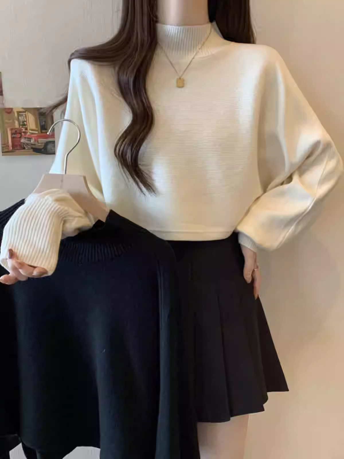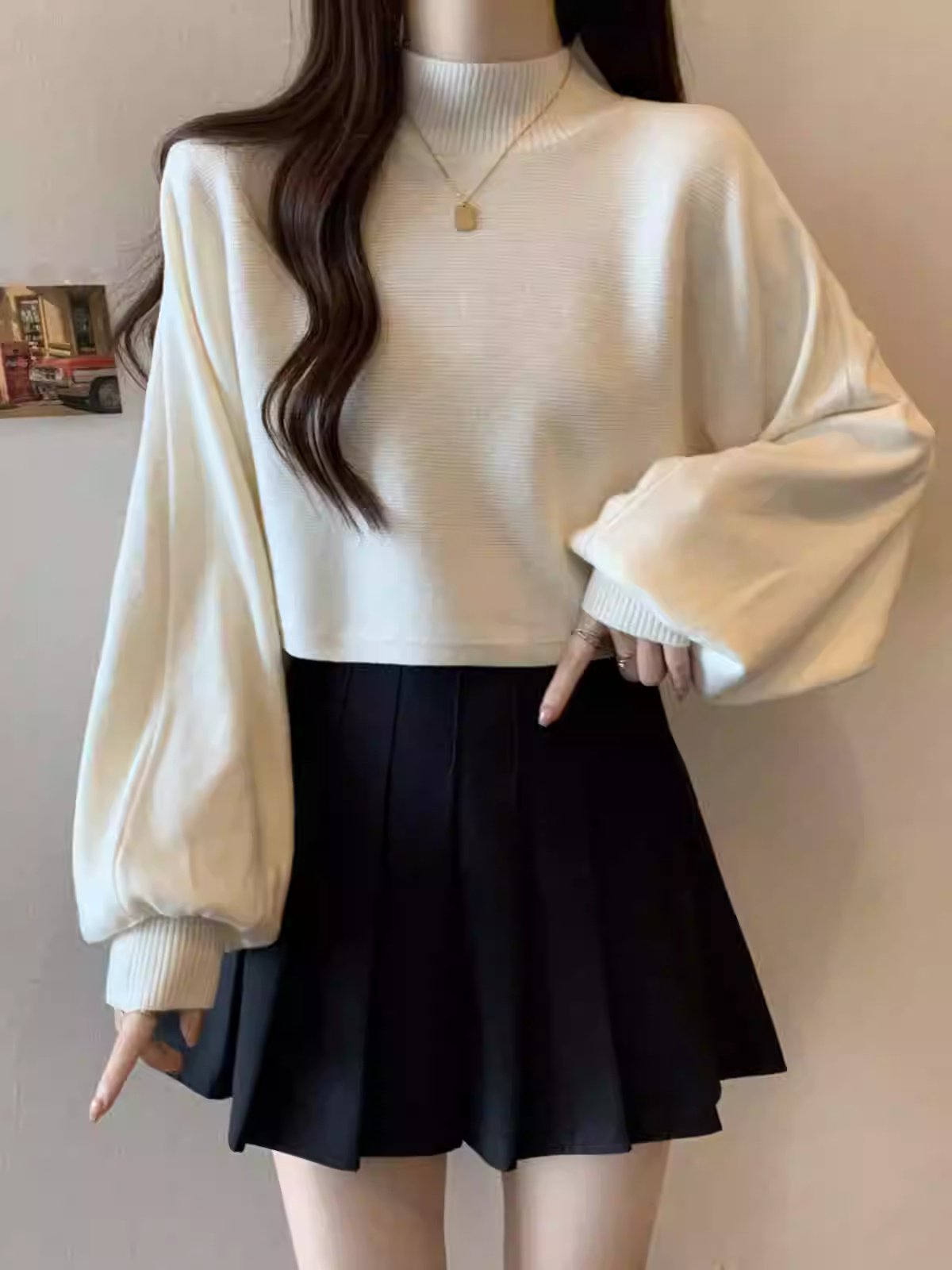 • 商品名称:半高领长袖针织打底衫女秋冬大码胖mm灯笼袖毛衣内搭宽松短款上衣