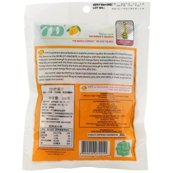 产品描述: 7D芒果干【配料】芒果、白砂糖、焦亚硫酸钠【净含量】100克【原产国】菲律宾【生产日期】见外包装(年/月/日)【贮存条件】于干燥阴凉处保存 7D芒果干生产商早期从事水果收购和销售,于1978年起开始加工芒果干,主要产品有芒果干,芒果汁和芒果蜜饯等。