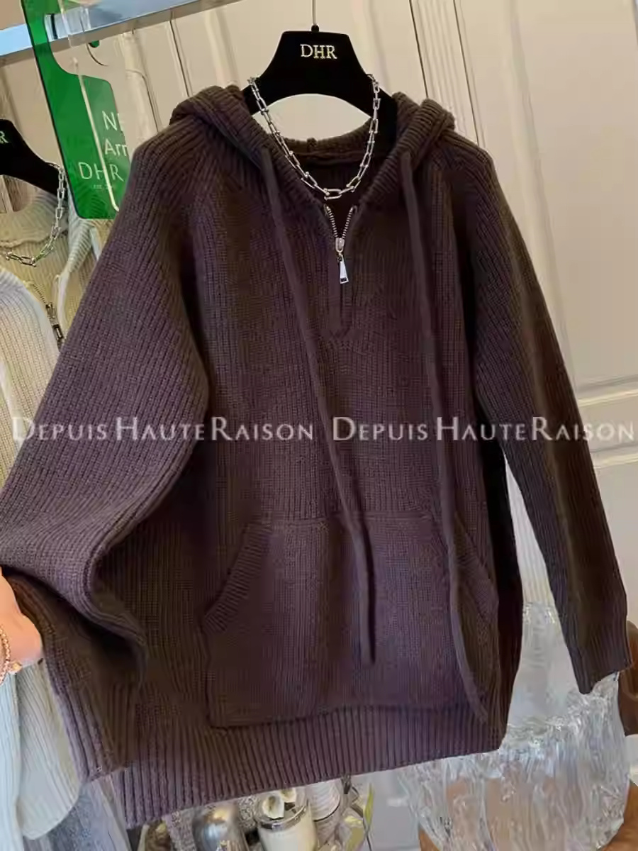 • 商品名称:胖mm300斤大码慵懒风连帽毛衣针织衫女秋冬宽松设计感半拉链上衣