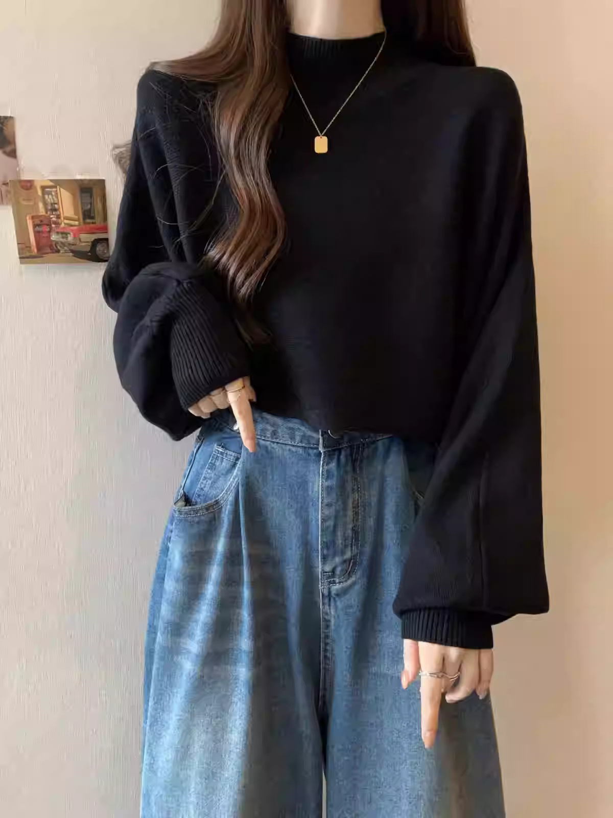 • 商品名称:半高领长袖针织打底衫女秋冬大码胖mm灯笼袖毛衣内搭宽松短款上衣